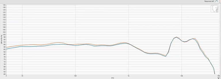 Measured frequency response (SPL vs. frequency) for the left (blue) and right (green) channels of the headphone. The overall frequency response is reasonably balanced and extended, with each part of the spectrum showing specific tuning characteristics. Channel matching is excellent: the left and right traces overlap almost entirely across frequencies, indicating only minute level differences (on the order of 1–2 dB or less) at a few points. Such tight matching speaks to good quality control; it is crucial for stable stereo imaging and an accurate soundstage