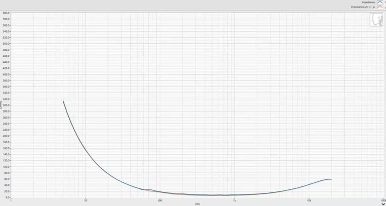 The impedance curve shows the headphone is very stable and easy to drive. Below 20 Hz there’s a big rise caused by the driver’s natural resonance, but since it’s below the audible range it doesn’t affect music. From bass through treble the impedance stays nearly flat at a few dozen ohms, with only a tiny rise at very high frequencies. This flat, resistive profile is typical of planar headphones and means they work consistently with most amplifiers.